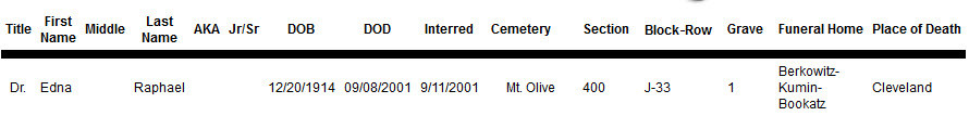 Dr. Edna Raphael, a member of the Reconstructionist Havurah of Cleveland - now Kol Ha Lev - died on September 8, 2001. Her funeral service began at 9 am on September 11. It was not yet a time of smart phones and live news, but by the time mourners left the funeral home they had heard about the World Trade Center attacks. On the long drive to Mount Olive Cemetery in Solon they would learn more on their car radios. It was before 11 am when the service of burial, led by Rabbi Steve Segar, ended with recitation of the Mourner's Prayer - the Kaddish - the ancient prayer for the dead. Its final line (in English) concludes: