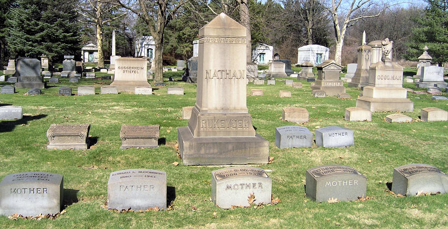 Moses Alsbacher, who led "the Alsbacher Party" of Jews from Unsleben Bavaria to Cleveland in 1839 and brought with him the ethical testament known as the Alsbacher Document, had four children and nine grandchildren. His family had burial rights at Willet Street Cemetery on the near west side and also, after 1887, in Mayfield Cemetery in Cleveland Heights. The first three generations of American Alsbachers are buried at Mayfield Cemetery: Moses, Yetta, all their children and their spouses and all their grandchildren and their spouses. Their graves are shown in this order: