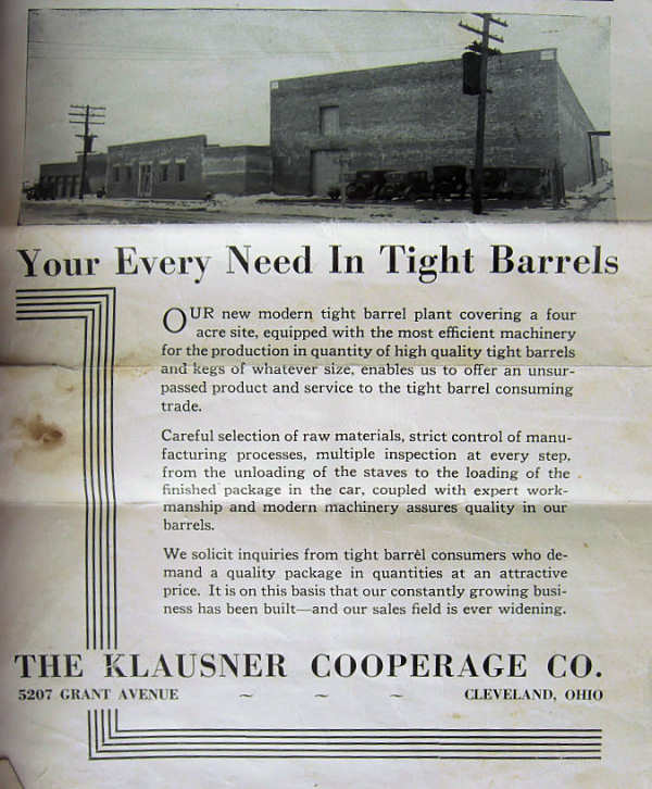 The Barrel Business In Borshivka, near Tetiev, Sam Klausner had become a cooper - he made wooden barrels. He had a barrel-making business in the yard of his house, taught his sons the trade and also employed others. Sam and his sons Nathan and Ben began by peddling used barrels. In 1923 Sam Klausner started Klausner Cooperage with a small shop near their home on East 51st Avenue near Woodland Avenue. Son Jake would soon join them. With Nathan and Ben leading the way and Jake supervising manufacturing, the business grew rapidly. It moved to 5207 Grant Avenue in Newburgh Heights where it had more land, better transportation for the oak coming in and the finished barrels being shipped out.