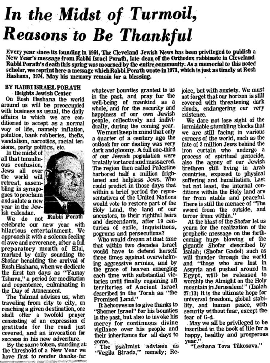 In 1974 as a memorial to Rabbi Porath the Cleveland Jewish News reprinted his eloquent Rosh Hashanah message of 1971.