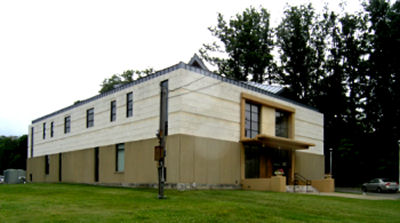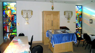 The building shown at the left is in Lyndhurst, Ohio, on the north side of Cedar Road, between Green and Richmond Roads. It was dedicated as Cedar Sinai Synagogue in 2011, the new home of Warrensville Center Synagogue - Kehillat Yaakov, which had been located on Warrensville Center Road, south of Mayfield Road. In July 2012 some members of Taylor Road Synagogue joined Cedar Sinai Synagogue, which then adopted a new name "Oheb Zedek Cedar Sinai Synagogue". The two congregations have not merged however. Though the outside of this building is simple, its interior is splendid. The lower picture at the left shows the chapel in the early morning light. The two stained glass windows in the chapel tell the history of the synagogue and its times. The window at the right, titled Immigration Window, donated by Lester Tavens and family, is dedicated to the memory of Rabbi Israel Porath and Rabbi David Genuth. The window is shown below, with an explanation of its design and information on the artist. Rabbi Israel Porath led the Oheb Zedek and N'vai Zedek congregations, which live on in the history of this shul. During his years as "dean" of Cleveland's Orthodox rabbis he did much to further unity and community. Thus it is specially appropriate that he be remembered here, in a congregation that describes itself as "The Modern Orthodox Shul for Unity and Community." |