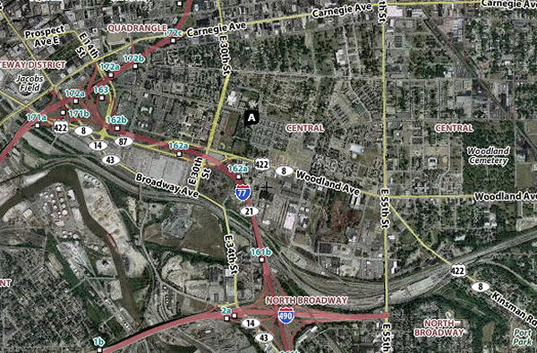 This Yahooİ map blends satellite imagery with labels for major sites and streets. It shows Woodland Avenue from its start at Broadway, to about East 80th Street. The aptly named Cuyahoga ("crooked") River can be seen in the lower left. To display an interactive version of this map, click here. The land near the river was swampy and bug-infested, so in 1796 Cleveland began up the hill, around what is now Public Square. In 1840 the city's first Jews settled southeast of Public Square, near the Central Market (see GATEWAY DISTRICT, upper left) and built their first synagogue in 1846 where Jacobs Field (now Progressive Field) is shown. As the city expanded from its core in all directions, except north of course, ethnic groups tended to not to cross the river. Irish on the near West Side might move west on Lorain Avenue, then to Kamms Corners, then Rocky River, then farther west. Some ethnic groups such as the Polish moved south or southeast. Many Italian immigrants would move east, from Woodland to Mayfield Road near Euclid (Little Italy), then to the suburbs. For the largely Roman Catholic immigrant population that arrived after 1880, these clustering patterns were reinforced by the many nationality-based parishes, where old-country customs and sermons in the old language would be a comfort to new arrivals.
