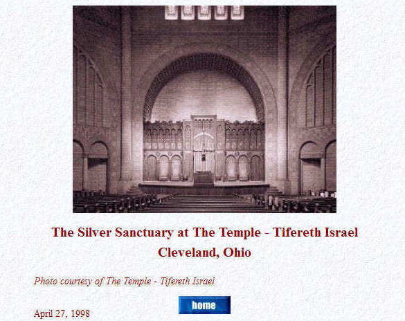 . . . So began a long relationship with The Temple. I attended services regularly and soon became a member. It is where I met my future bride, where we would marry in 1958 and where our daughters Susan, Margaret and Joanie became Bat Mitzvah and were confirmed. That was many years ago. Abba Hillel Silver died in 1963 at the age of 70, having served his congregation for 46 years. The center of activities for "The Temple - Tifereth Israel" moved east, following its members. But the magnificent old Temple in Cleveland's University Circle is still there, used for community meetings, the High Holy Days and life cycle events. One of those life cycle events was the wedding of my youngest daughter Joanie. In April 1998, as part of a website I built to celebrate the wedding, I created pages about the scene of the wedding, the Silver Sanctuary. Doing this brought back memories of Abba Hillel Silver, perhaps the most eloquent and inspirational man I had ever known, and someone who had helped change the course of Jewish history. The wedding pages finished, I began to look for web-based information about Abba Hillel Silver. I visited almost every one of the nearly 200 "hits" revealed by search engines and my bookmark file grew. Then I created a small web page using a few of the more interesting links. The web page grew and became a small site. As The Temple-Tifereth Israel had no website in 1998, I added photos of the building where Abba Hillel Silver spent 39 years of his life as a rabbi. Last, as a personal note, I added some recollections, hoping that later others might furnish more. I hope you will find these pages interesting. Arnold Berger To learn about me, click here. |