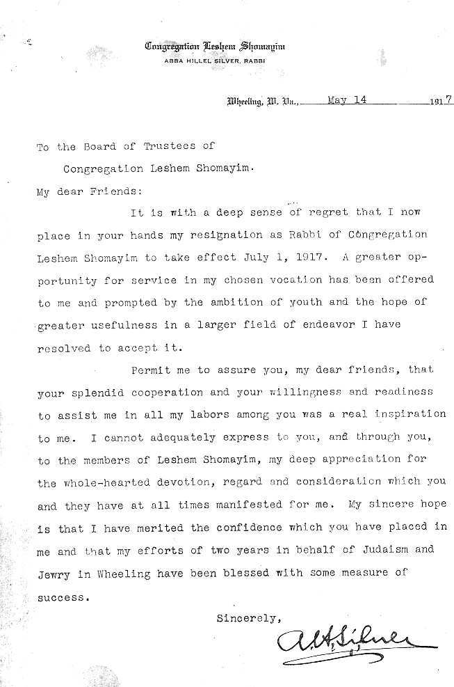 Abba Hillel Silver's Resignation Letter to Leshem Shomayim