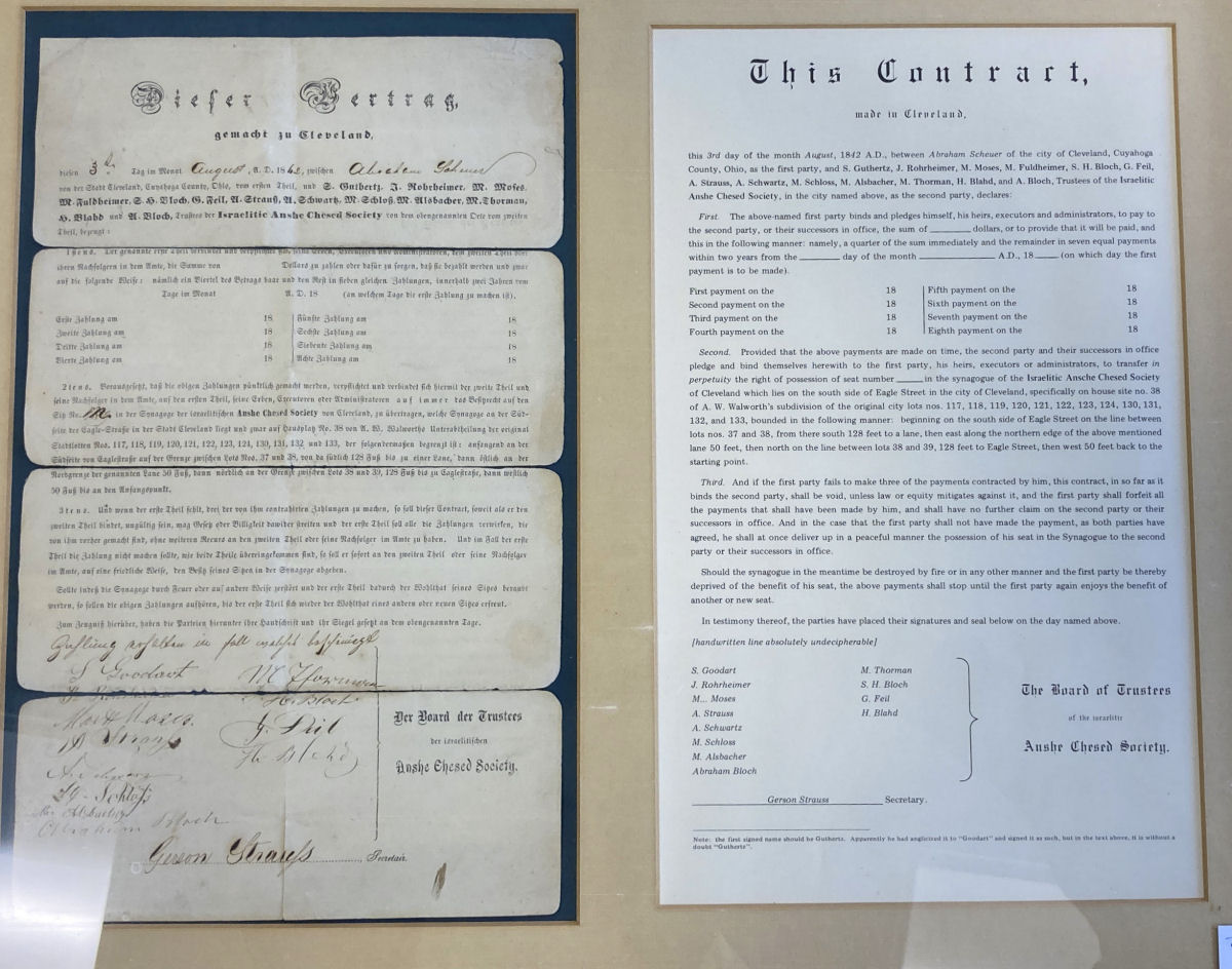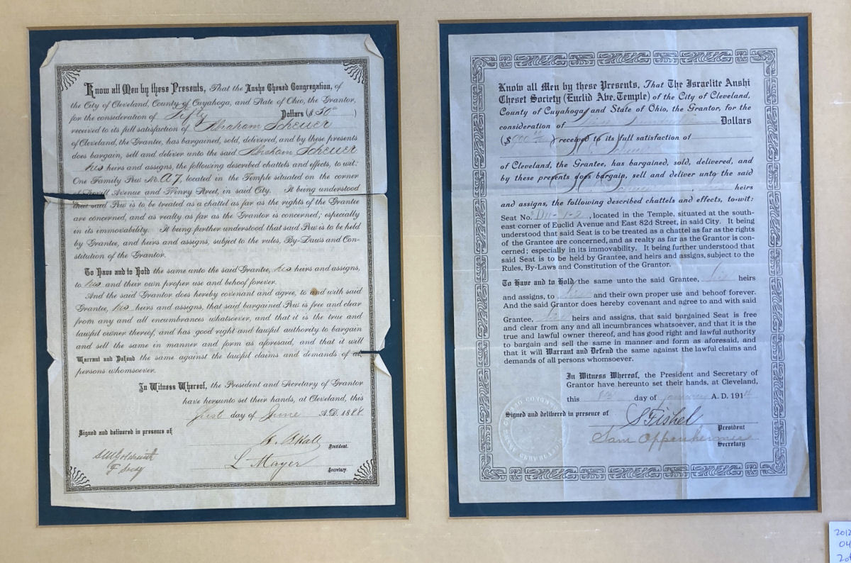 The family of Abraham Scheuer (born in Germany in 1824, died in Cleveland on August 26, 1890) saved and then framed three seat license documents for Congregation Anshe Chesed, today Anshe Chesed Fairmount Temple. They are now in the Jewish Archives of the Western Reserve Historical Society. These treasures were gifts of Shirley Stein Aaronin in 2012; Anshe Chesed Fairmount Temple in 1998 and 2002; and John and Mary Ann Hexter in 2012.